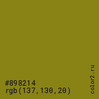 Цвет #898214 в цветовой модели RGB обозначается тремя октетами (137, 130, 20) в десятичном формате и #898214 в шестнадцатиричном (hex) формате, которые являются интенсивностью красного 137 (hex 89), интенсивность зелёного 130 (hex 82) и интенсивность синего 20 (hex 14).