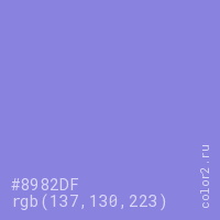 Цвет #8982DF в цветовой модели RGB обозначается тремя октетами (137, 130, 223) в десятичном формате и #8982DF в шестнадцатиричном (hex) формате, которые являются интенсивностью красного 137 (hex 89), интенсивность зелёного 130 (hex 82) и интенсивность синего 223 (hex DF).