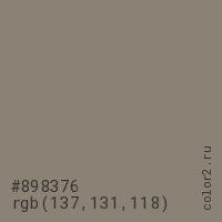 Цвет #898376 в цветовой модели RGB обозначается тремя октетами (137, 131, 118) в десятичном формате и #898376 в шестнадцатиричном (hex) формате, которые являются интенсивностью красного 137 (hex 89), интенсивность зелёного 131 (hex 83) и интенсивность синего 118 (hex 76).