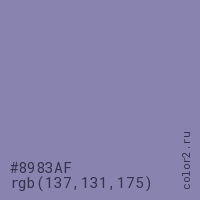 Цвет #8983AF в цветовой модели RGB обозначается тремя октетами (137, 131, 175) в десятичном формате и #8983AF в шестнадцатиричном (hex) формате, которые являются интенсивностью красного 137 (hex 89), интенсивность зелёного 131 (hex 83) и интенсивность синего 175 (hex AF).