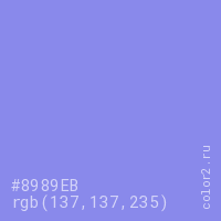Цвет #8989EB в цветовой модели RGB обозначается тремя октетами (137, 137, 235) в десятичном формате и #8989EB в шестнадцатиричном (hex) формате, которые являются интенсивностью красного 137 (hex 89), интенсивность зелёного 137 (hex 89) и интенсивность синего 235 (hex EB).