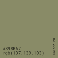 Цвет #898B67 в цветовой модели RGB обозначается тремя октетами (137, 139, 103) в десятичном формате и #898B67 в шестнадцатиричном (hex) формате, которые являются интенсивностью красного 137 (hex 89), интенсивность зелёного 139 (hex 8B) и интенсивность синего 103 (hex 67).