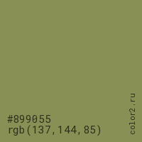 Цвет #899055 в цветовой модели RGB обозначается тремя октетами (137, 144, 85) в десятичном формате и #899055 в шестнадцатиричном (hex) формате, которые являются интенсивностью красного 137 (hex 89), интенсивность зелёного 144 (hex 90) и интенсивность синего 85 (hex 55).