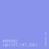 Цвет #8993EC в цветовой модели RGB обозначается тремя октетами (137, 147, 236) в десятичном формате и #8993EC в шестнадцатиричном (hex) формате, которые являются интенсивностью красного 137 (hex 89), интенсивность зелёного 147 (hex 93) и интенсивность синего 236 (hex EC).