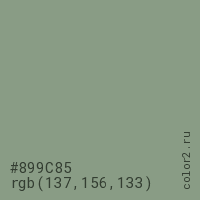 Цвет #899C85 в цветовой модели RGB обозначается тремя октетами (137, 156, 133) в десятичном формате и #899C85 в шестнадцатиричном (hex) формате, которые являются интенсивностью красного 137 (hex 89), интенсивность зелёного 156 (hex 9C) и интенсивность синего 133 (hex 85).
