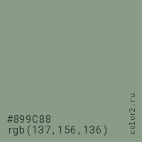Цвет #899C88 в цветовой модели RGB обозначается тремя октетами (137, 156, 136) в десятичном формате и #899C88 в шестнадцатиричном (hex) формате, которые являются интенсивностью красного 137 (hex 89), интенсивность зелёного 156 (hex 9C) и интенсивность синего 136 (hex 88).