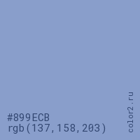 Цвет #899ECB в цветовой модели RGB обозначается тремя октетами (137, 158, 203) в десятичном формате и #899ECB в шестнадцатиричном (hex) формате, которые являются интенсивностью красного 137 (hex 89), интенсивность зелёного 158 (hex 9E) и интенсивность синего 203 (hex CB).