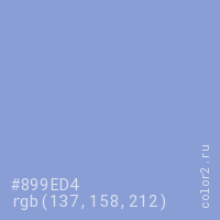 Цвет #899ED4 в цветовой модели RGB обозначается тремя октетами (137, 158, 212) в десятичном формате и #899ED4 в шестнадцатиричном (hex) формате, которые являются интенсивностью красного 137 (hex 89), интенсивность зелёного 158 (hex 9E) и интенсивность синего 212 (hex D4).