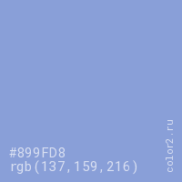 Цвет #899FD8 в цветовой модели RGB обозначается тремя октетами (137, 159, 216) в десятичном формате и #899FD8 в шестнадцатиричном (hex) формате, которые являются интенсивностью красного 137 (hex 89), интенсивность зелёного 159 (hex 9F) и интенсивность синего 216 (hex D8).