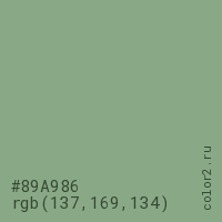 Цвет #89A986 в цветовой модели RGB обозначается тремя октетами (137, 169, 134) в десятичном формате и #89A986 в шестнадцатиричном (hex) формате, которые являются интенсивностью красного 137 (hex 89), интенсивность зелёного 169 (hex A9) и интенсивность синего 134 (hex 86).