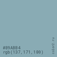 Цвет #89ABB4 в цветовой модели RGB обозначается тремя октетами (137, 171, 180) в десятичном формате и #89ABB4 в шестнадцатиричном (hex) формате, которые являются интенсивностью красного 137 (hex 89), интенсивность зелёного 171 (hex AB) и интенсивность синего 180 (hex B4).