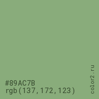 Цвет #89AC7B в цветовой модели RGB обозначается тремя октетами (137, 172, 123) в десятичном формате и #89AC7B в шестнадцатиричном (hex) формате, которые являются интенсивностью красного 137 (hex 89), интенсивность зелёного 172 (hex AC) и интенсивность синего 123 (hex 7B).
