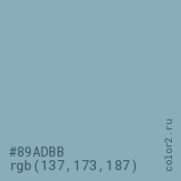Цвет #89ADBB в цветовой модели RGB обозначается тремя октетами (137, 173, 187) в десятичном формате и #89ADBB в шестнадцатиричном (hex) формате, которые являются интенсивностью красного 137 (hex 89), интенсивность зелёного 173 (hex AD) и интенсивность синего 187 (hex BB).