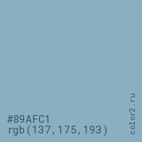 Цвет #89AFC1 в цветовой модели RGB обозначается тремя октетами (137, 175, 193) в десятичном формате и #89AFC1 в шестнадцатиричном (hex) формате, которые являются интенсивностью красного 137 (hex 89), интенсивность зелёного 175 (hex AF) и интенсивность синего 193 (hex C1).