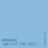 Цвет #89BADE в цветовой модели RGB обозначается тремя октетами (137, 186, 222) в десятичном формате и #89BADE в шестнадцатиричном (hex) формате, которые являются интенсивностью красного 137 (hex 89), интенсивность зелёного 186 (hex BA) и интенсивность синего 222 (hex DE).