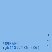 Цвет #89BAEC в цветовой модели RGB обозначается тремя октетами (137, 186, 236) в десятичном формате и #89BAEC в шестнадцатиричном (hex) формате, которые являются интенсивностью красного 137 (hex 89), интенсивность зелёного 186 (hex BA) и интенсивность синего 236 (hex EC).