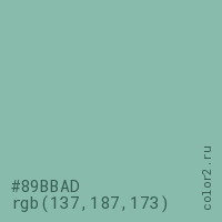 Цвет #89BBAD в цветовой модели RGB обозначается тремя октетами (137, 187, 173) в десятичном формате и #89BBAD в шестнадцатиричном (hex) формате, которые являются интенсивностью красного 137 (hex 89), интенсивность зелёного 187 (hex BB) и интенсивность синего 173 (hex AD).