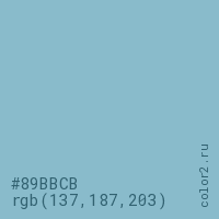 Цвет #89BBCB в цветовой модели RGB обозначается тремя октетами (137, 187, 203) в десятичном формате и #89BBCB в шестнадцатиричном (hex) формате, которые являются интенсивностью красного 137 (hex 89), интенсивность зелёного 187 (hex BB) и интенсивность синего 203 (hex CB).