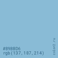 Цвет #89BBD6 в цветовой модели RGB обозначается тремя октетами (137, 187, 214) в десятичном формате и #89BBD6 в шестнадцатиричном (hex) формате, которые являются интенсивностью красного 137 (hex 89), интенсивность зелёного 187 (hex BB) и интенсивность синего 214 (hex D6).