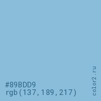 Цвет #89BDD9 в цветовой модели RGB обозначается тремя октетами (137, 189, 217) в десятичном формате и #89BDD9 в шестнадцатиричном (hex) формате, которые являются интенсивностью красного 137 (hex 89), интенсивность зелёного 189 (hex BD) и интенсивность синего 217 (hex D9).
