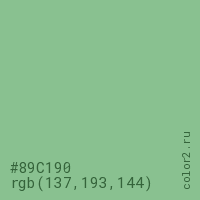 Цвет #89C190 в цветовой модели RGB обозначается тремя октетами (137, 193, 144) в десятичном формате и #89C190 в шестнадцатиричном (hex) формате, которые являются интенсивностью красного 137 (hex 89), интенсивность зелёного 193 (hex C1) и интенсивность синего 144 (hex 90).