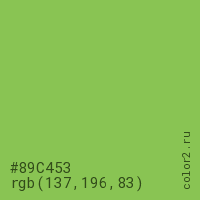 Цвет #89C453 в цветовой модели RGB обозначается тремя октетами (137, 196, 83) в десятичном формате и #89C453 в шестнадцатиричном (hex) формате, которые являются интенсивностью красного 137 (hex 89), интенсивность зелёного 196 (hex C4) и интенсивность синего 83 (hex 53).