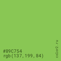Цвет #89C754 в цветовой модели RGB обозначается тремя октетами (137, 199, 84) в десятичном формате и #89C754 в шестнадцатиричном (hex) формате, которые являются интенсивностью красного 137 (hex 89), интенсивность зелёного 199 (hex C7) и интенсивность синего 84 (hex 54).