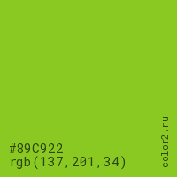 Цвет #89C922 в цветовой модели RGB обозначается тремя октетами (137, 201, 34) в десятичном формате и #89C922 в шестнадцатиричном (hex) формате, которые являются интенсивностью красного 137 (hex 89), интенсивность зелёного 201 (hex C9) и интенсивность синего 34 (hex 22).