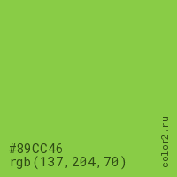 Цвет #89CC46 в цветовой модели RGB обозначается тремя октетами (137, 204, 70) в десятичном формате и #89CC46 в шестнадцатиричном (hex) формате, которые являются интенсивностью красного 137 (hex 89), интенсивность зелёного 204 (hex CC) и интенсивность синего 70 (hex 46).