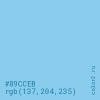 Цвет #89CCEB в цветовой модели RGB обозначается тремя октетами (137, 204, 235) в десятичном формате и #89CCEB в шестнадцатиричном (hex) формате, которые являются интенсивностью красного 137 (hex 89), интенсивность зелёного 204 (hex CC) и интенсивность синего 235 (hex EB).