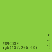 Цвет #89CD3F в цветовой модели RGB обозначается тремя октетами (137, 205, 63) в десятичном формате и #89CD3F в шестнадцатиричном (hex) формате, которые являются интенсивностью красного 137 (hex 89), интенсивность зелёного 205 (hex CD) и интенсивность синего 63 (hex 3F).