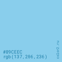 Цвет #89CEEC в цветовой модели RGB обозначается тремя октетами (137, 206, 236) в десятичном формате и #89CEEC в шестнадцатиричном (hex) формате, которые являются интенсивностью красного 137 (hex 89), интенсивность зелёного 206 (hex CE) и интенсивность синего 236 (hex EC).