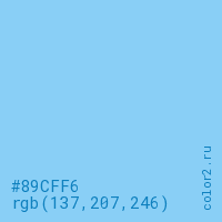 Цвет #89CFF6 в цветовой модели RGB обозначается тремя октетами (137, 207, 246) в десятичном формате и #89CFF6 в шестнадцатиричном (hex) формате, которые являются интенсивностью красного 137 (hex 89), интенсивность зелёного 207 (hex CF) и интенсивность синего 246 (hex F6).