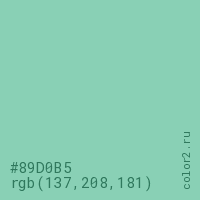 Цвет #89D0B5 в цветовой модели RGB обозначается тремя октетами (137, 208, 181) в десятичном формате и #89D0B5 в шестнадцатиричном (hex) формате, которые являются интенсивностью красного 137 (hex 89), интенсивность зелёного 208 (hex D0) и интенсивность синего 181 (hex B5).