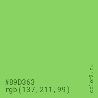 Цвет #89D363 в цветовой модели RGB обозначается тремя октетами (137, 211, 99) в десятичном формате и #89D363 в шестнадцатиричном (hex) формате, которые являются интенсивностью красного 137 (hex 89), интенсивность зелёного 211 (hex D3) и интенсивность синего 99 (hex 63).