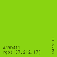 Цвет #89D411 в цветовой модели RGB обозначается тремя октетами (137, 212, 17) в десятичном формате и #89D411 в шестнадцатиричном (hex) формате, которые являются интенсивностью красного 137 (hex 89), интенсивность зелёного 212 (hex D4) и интенсивность синего 17 (hex 11).