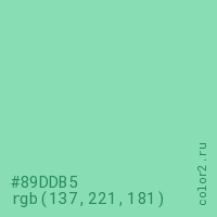 Цвет #89DDB5 в цветовой модели RGB обозначается тремя октетами (137, 221, 181) в десятичном формате и #89DDB5 в шестнадцатиричном (hex) формате, которые являются интенсивностью красного 137 (hex 89), интенсивность зелёного 221 (hex DD) и интенсивность синего 181 (hex B5).