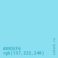 Цвет #89DEF0 в цветовой модели RGB обозначается тремя октетами (137, 222, 240) в десятичном формате и #89DEF0 в шестнадцатиричном (hex) формате, которые являются интенсивностью красного 137 (hex 89), интенсивность зелёного 222 (hex DE) и интенсивность синего 240 (hex F0).