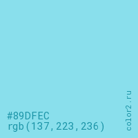 Цвет #89DFEC в цветовой модели RGB обозначается тремя октетами (137, 223, 236) в десятичном формате и #89DFEC в шестнадцатиричном (hex) формате, которые являются интенсивностью красного 137 (hex 89), интенсивность зелёного 223 (hex DF) и интенсивность синего 236 (hex EC).