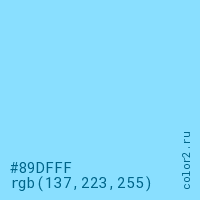 Цвет #89DFFF в цветовой модели RGB обозначается тремя октетами (137, 223, 255) в десятичном формате и #89DFFF в шестнадцатиричном (hex) формате, которые являются интенсивностью красного 137 (hex 89), интенсивность зелёного 223 (hex DF) и интенсивность синего 255 (hex FF).