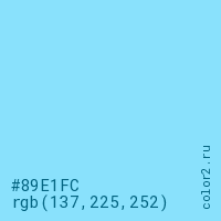 Цвет #89E1FC в цветовой модели RGB обозначается тремя октетами (137, 225, 252) в десятичном формате и #89E1FC в шестнадцатиричном (hex) формате, которые являются интенсивностью красного 137 (hex 89), интенсивность зелёного 225 (hex E1) и интенсивность синего 252 (hex FC).
