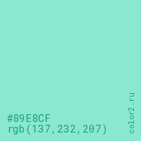 Цвет #89E8CF в цветовой модели RGB обозначается тремя октетами (137, 232, 207) в десятичном формате и #89E8CF в шестнадцатиричном (hex) формате, которые являются интенсивностью красного 137 (hex 89), интенсивность зелёного 232 (hex E8) и интенсивность синего 207 (hex CF).