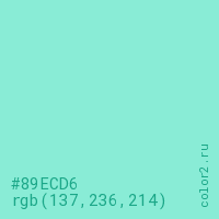 Цвет #89ECD6 в цветовой модели RGB обозначается тремя октетами (137, 236, 214) в десятичном формате и #89ECD6 в шестнадцатиричном (hex) формате, которые являются интенсивностью красного 137 (hex 89), интенсивность зелёного 236 (hex EC) и интенсивность синего 214 (hex D6).