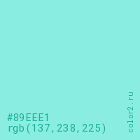Цвет #89EEE1 в цветовой модели RGB обозначается тремя октетами (137, 238, 225) в десятичном формате и #89EEE1 в шестнадцатиричном (hex) формате, которые являются интенсивностью красного 137 (hex 89), интенсивность зелёного 238 (hex EE) и интенсивность синего 225 (hex E1).