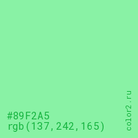 Цвет #89F2A5 в цветовой модели RGB обозначается тремя октетами (137, 242, 165) в десятичном формате и #89F2A5 в шестнадцатиричном (hex) формате, которые являются интенсивностью красного 137 (hex 89), интенсивность зелёного 242 (hex F2) и интенсивность синего 165 (hex A5).