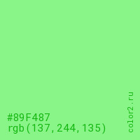 Цвет #89F487 в цветовой модели RGB обозначается тремя октетами (137, 244, 135) в десятичном формате и #89F487 в шестнадцатиричном (hex) формате, которые являются интенсивностью красного 137 (hex 89), интенсивность зелёного 244 (hex F4) и интенсивность синего 135 (hex 87).