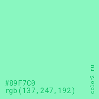 Цвет #89F7C0 в цветовой модели RGB обозначается тремя октетами (137, 247, 192) в десятичном формате и #89F7C0 в шестнадцатиричном (hex) формате, которые являются интенсивностью красного 137 (hex 89), интенсивность зелёного 247 (hex F7) и интенсивность синего 192 (hex C0).