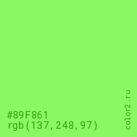 Цвет #89F861 в цветовой модели RGB обозначается тремя октетами (137, 248, 97) в десятичном формате и #89F861 в шестнадцатиричном (hex) формате, которые являются интенсивностью красного 137 (hex 89), интенсивность зелёного 248 (hex F8) и интенсивность синего 97 (hex 61).