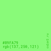 Цвет #89FA79 в цветовой модели RGB обозначается тремя октетами (137, 250, 121) в десятичном формате и #89FA79 в шестнадцатиричном (hex) формате, которые являются интенсивностью красного 137 (hex 89), интенсивность зелёного 250 (hex FA) и интенсивность синего 121 (hex 79).