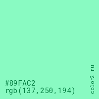 Цвет #89FAC2 в цветовой модели RGB обозначается тремя октетами (137, 250, 194) в десятичном формате и #89FAC2 в шестнадцатиричном (hex) формате, которые являются интенсивностью красного 137 (hex 89), интенсивность зелёного 250 (hex FA) и интенсивность синего 194 (hex C2).